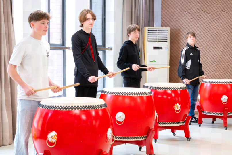 在鄞州中学民乐教室,德国学生换上飘逸的汉服,或坐在古筝、箜篌前轻轻拨弦,或拿起鼓槌敲起中国鼓。不少学生由衷感叹:“身着汉服弹奏古筝,仿佛时光都变得舒缓悠长。”
